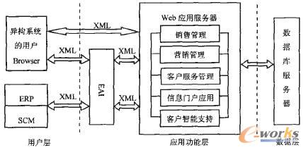 包括ERP、SCM等其他企業(yè)應用在內的所有的系統用戶與應用功能層的數據交換均通過XMI數據進行傳輸,從而大大減小了各種企業(yè)應用系統間的通信阻力,為EAI提供了良好的通信平臺。Web用戶的客戶端只是“瘦小的”瀏覽器日_數量不受限制,不需要安裝專門的軟件,這使得凡可以接入Internet的用戶都可以方便、靈活地使用系統,大大提升了系統用戶間溝通、協作的效率。此外,由于CRM應用系統是在中央服務器上實施和維護的,對客戶端的要求遠沒有C/S結構那么高,集中的軟件實施和維護大大節(jié)約了企業(yè)的運行成本和維護費用。圖1描述的是筆者所要闡述的適應網絡環(huán)境的基于Web的系統平臺架構,這并不意味著CRM應用系統完全以這種方式運行,事實上用戶接入CRM系統的方式是多種多樣的,系統還應該提供電話、傳真、無線接入等多種接入接口。