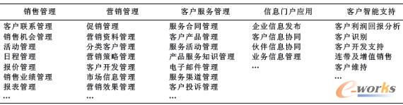 CRM應用系統功能平臺對應于平臺架構中的應用功能層,是系統平臺的卞體部分;趯企業(yè)的需求分析及B/S的平臺架構特點,筆者將系統功能綜合歸納為銷信管理、營銷管理、客戶服務管理、信息門戶應用及客戶智能支持5大模塊,它們共同構成的系統的功能平臺如圖2所示,詳細功能設計如表1所示。