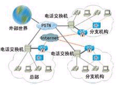 目前,大多數大型企業(yè)與分支機構的電話和計算機網絡是相互獨立的,分處各地的辦公機構建有局域網,局域網之間通過Internet或企業(yè)專網互連,企業(yè)的數據業(yè)務通過計算機網絡傳輸。而各辦公機構的電話網則采用傳統(tǒng)的電話交換機或集團電話,內部員工之間相互是分機撥號,電話交換機接入電信電話公網,與外部的語音交流需要通過本地電話網或長途電話網。