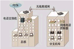 如圖2所示,兩個辦公樓之間距離較遠,不方便布線,其計算機網絡可以通過無線局域網來連接。在總部已有電話交換機系統(tǒng),這時只需在分支機構中增加Cisco網絡電話控制器,布署IP電話機,然后通過總部帶語音模塊的Cisco路由器或交換機,接入總部的電話交換機,分支機構就可以享用總部的電話中繼線路,與總部一樣自由地使用電話系統(tǒng)。