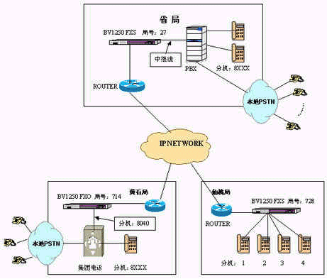 黃石局…呼叫各分支局:本地接入BV1250/FXO的分機(jī)號(hào)碼 + 對方局號(hào)+對方分機(jī)號(hào)碼。