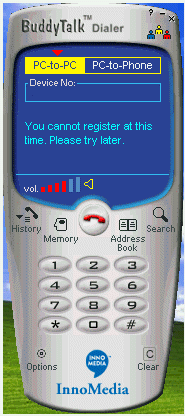 。ㄈ鐖D3),這個就是BuddyTalk的軟件界面。這象不象一個手機(jī)?上面的藍(lán)色部分是液晶屏。你可以選擇pc-to-pc或者pc-to-phone,下面是用來輸入電話號碼的一個空框,空框下面的部分是軟件顯示提示信息的,再下面是音量大小的顯示器。液晶屏的下面部分跟手機(jī)幾乎一樣,其中一個“search”,這是用來上網(wǎng)實現(xiàn)全球用戶數(shù)據(jù)庫搜索,一個“options”,各種設(shè)置可以在這里完成,“Memory”記錄的是你通話信息,以利快速撥號。