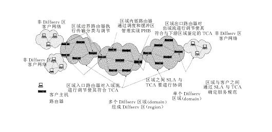 區(qū)分服務(wù)是由綜合服務(wù)(Int-serv )發(fā)展而來的,它采用了IETF的基于RSVP的服務(wù)分類標(biāo)準(zhǔn),拋棄了分組流沿路節(jié)點(diǎn)上的資源預(yù)留。區(qū)分服務(wù)將會有效地取代跨越大范圍的RSVP的使用。區(qū)分服務(wù)區(qū)域的主要成員有:核心路由器、邊緣路由器、資源控制器(BB,Bandwidth Broker)。在區(qū)分服務(wù)中,網(wǎng)絡(luò)的邊緣設(shè)備對每個分組進(jìn)行分類、標(biāo)記DS域,用DS域來攜帶IP分組對服務(wù)的需求信息。在網(wǎng)絡(luò)的核心節(jié)點(diǎn)上,路由器根據(jù)分組頭上的DS碼點(diǎn)(Code Point)選擇碼點(diǎn)所對應(yīng)的轉(zhuǎn)發(fā)處理。資源控制器BB配置了管理規(guī)則,為客戶分配資源,它可以通過服務(wù)級別協(xié)定SLA (Service Level Agreement)與客戶進(jìn)行相互協(xié)調(diào)以分享規(guī)定的帶寬。