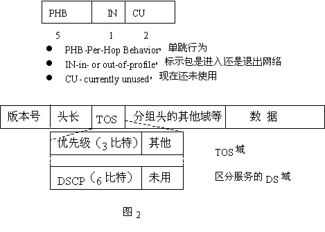 QoS的業(yè)務(wù)區(qū)分結(jié)構(gòu)使用IPV4報頭中的業(yè)務(wù)類型(TOS)字段,并將8位TOS字段重新命名,作為DS字段,其中6位可供目前使用,其余2位以備將來使用。該字段可以按照預(yù)先確定好的規(guī)則加以定義,使下行節(jié)點(diǎn)通過識別這個字段,獲取足夠的信息來處理到達(dá)輸入端口的數(shù)據(jù)包并將他們正確地轉(zhuǎn)發(fā)給下一跳的路由器。這里需要注意的是在IPV4網(wǎng)中所定義的TOS字段與在Diff-Serv中的DS字段不同。TOS字段的定義如圖2所示。圖IPV4報頭中TOS字段定義Diff-Serv充分考慮了IP網(wǎng)絡(luò)本身靈活,可擴(kuò)展性強(qiáng)的特點(diǎn),將復(fù)雜的服務(wù)質(zhì)量保證通過DS字段轉(zhuǎn)換為先進(jìn)的單跳行為,從而大大減少了信令的工作。