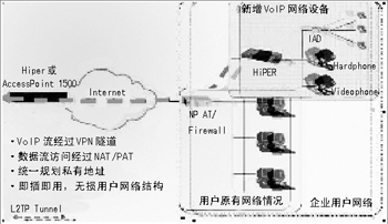 用戶的數(shù)據(jù)網(wǎng)絡(luò)仍然通過原有的路由器做NAT/PAT,而新增加的話音部分通過HiPER和上層的VPN服務(wù)器建立L2TP的隧道。L2TP隧道可以由用戶端的HiPER發(fā)起,這時HiPER充當(dāng)L2TP LAC的角色。中心的L2TP服務(wù)器也可以選擇HiPER充當(dāng)L2TP LNS。在網(wǎng)絡(luò)規(guī)模較大的地方,還可以使用Access Point 1500或Cisco7120等設(shè)備。這種解決方案,有效地解決了數(shù)據(jù)網(wǎng)絡(luò)和話音網(wǎng)絡(luò)混合的問題。