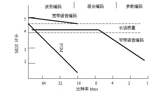 長(zhǎng)話質(zhì)量編碼器在比特率高于8Kbps時(shí)容易實(shí)現(xiàn),如圖4-2所示。長(zhǎng)話質(zhì)量的語(yǔ)音平均意見得分(MOS)必須在分或許分以上。傳統(tǒng)的PCN語(yǔ)音在比特率小于32