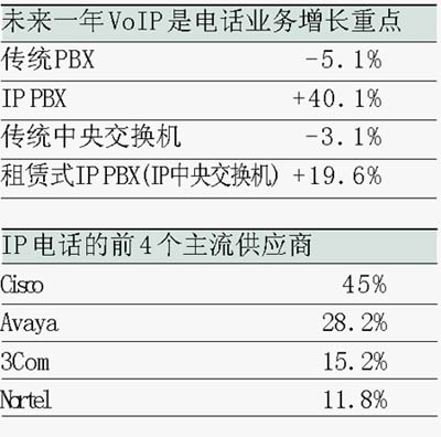 事實上,北美市場的實際銷售量已經(jīng)表明,市場中的傳統(tǒng)語音交換機銷售量已經(jīng)在明顯下降,而具備IP功能或純IP系統(tǒng)的銷售量卻在穩(wěn)步上升。Gartner 預(yù)計,2005年在北美地區(qū)銷售的純IP系統(tǒng)總價值將高達9.03億美元,比2004年的6.86億美元上升32%。同時,傳統(tǒng)電路交換系統(tǒng)的銷售量將從2004年的14億美元下降至9.99億美元,下降的幅度是32%。而混合式系統(tǒng)的銷量增長幅度可望達到30%,也就是說,從2004年的1.5億美元增長到2005年的2億美元。