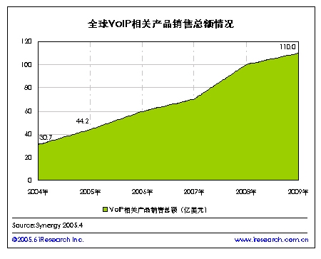 艾瑞市場咨詢(iResearch)根據(jù)Synergy的數(shù)據(jù)整理顯示,隨著VoIP市場的開發(fā),企業(yè)用戶對VoIP的接受度增加,在2004年VoIP相關(guān)產(chǎn)品的銷售總額達(dá)到了30.7億美元,預(yù)計(jì)在2005年可達(dá)到44.2億美元,2009年將突破110億美元。