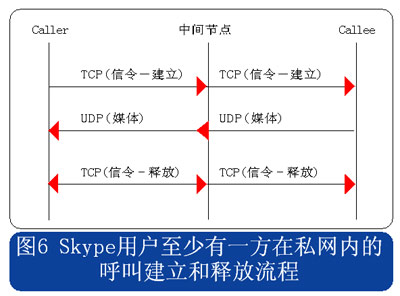 從上述流程圖可見,Skype的呼叫信令都采用TCP封裝,而媒體流則使用UDP封裝,當有任何一方用戶位于限制UDP包的防火墻內(nèi)時,媒體流就會采用TCP封裝。另外當Skype用戶至少有一方位于私網(wǎng)內(nèi)時,所有的信令和媒體消息都經(jīng)過一個或多個中間節(jié)點轉(zhuǎn)發(fā)。此時無需擔心用戶通話的媒體流因為經(jīng)過中間節(jié)點轉(zhuǎn)發(fā)而被竊聽,因為Skype采用了對消息進行端到端加密的機制。