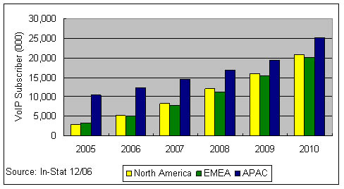 應該說在2006年,VoIP技術已經不是阻礙其市場發(fā)展的主要因素,因為In-Stat在全球個人VoIP消費市場中作的調查顯示,約9%的VoIP用戶甚至不清楚自己在使用IP傳輸;有64%的用戶在使用免費的VoIP服務。其次有超過73%的用戶并不把是否使用IP技術當成選擇該業(yè)務的影響因素。而寬帶接入市場的競爭則構成了VoIP發(fā)展的關鍵因素,作為一種寬帶應用,誰的接入資源占據(jù)了用戶家庭,誰就可以決定是否采用VoIP技術來提供語音業(yè)務。在歐洲法國Free Telecom與意大利的FastWeb都是三重播放業(yè)務的積極推進者,在VoIP市場居領先地位;在日本Yahoo!BB擁有亞洲地區(qū)50%的寬帶VoIP用戶。幾乎所有這些寬帶ISP提供商往往采用包月的形式或者以極低的費用提供無限制的本地或國內通話,在國際長途電話上提供極大的折扣。