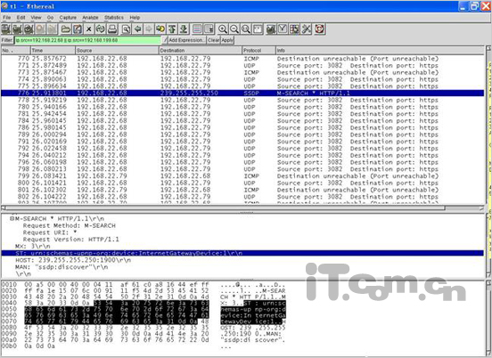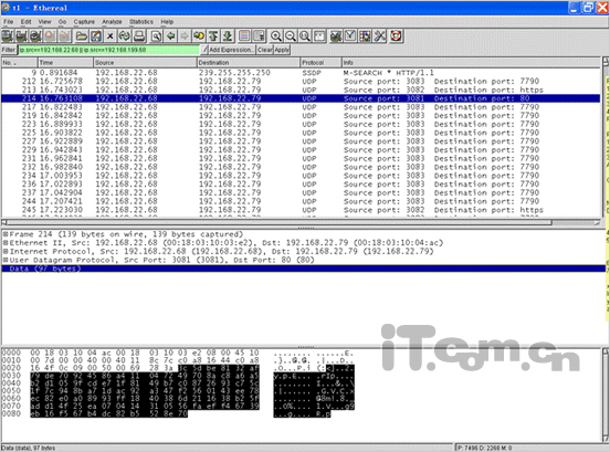 我們在局域網(wǎng)中放入兩臺(tái)callfreee設(shè)備,同時(shí)接入一臺(tái)PC運(yùn)行ethereal軟件進(jìn)行抓包來分析協(xié)議。