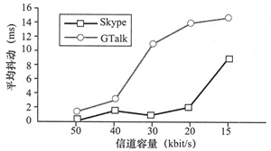 kbit/s時(shí),GTalk發(fā)生了很明顯的變化,傳輸速率降低到了35 kbit/s。這個變化使得其PESQ MOS分?jǐn)?shù)與Skype相比有所提高,而Skype的傳輸速率則接近信道容量。當(dāng)信道容量變?yōu)?0