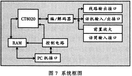 ——硬件平臺(tái)構(gòu)造于PC機(jī)上,采用ISA總線插卡方式,如圖7所示。該平臺(tái)采用了美國(guó)DSPG公司的專用數(shù)字信號(hào)處理器CT8020作為核心部件,利用先進(jìn)的可編程邏輯器件開(kāi)發(fā)了外圍控制電路和接口電路。它主要完成以下功能。