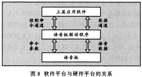 ——為便于在Windows95環(huán)境下使用該平臺(tái),開(kāi)發(fā)了虛擬設(shè)備驅(qū)動(dòng)程序。該程序?yàn)樯蠈榆浖峁┝素S富的接口函數(shù),用于實(shí)現(xiàn)對(duì)語(yǔ)音板的操作。軟件平臺(tái)與硬件平臺(tái)的關(guān)系如圖8所示。