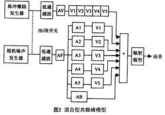 ----混 合 型 共 振 峰 模 型 在 級 聯(lián) 型 共 振 峰 合 成 模 型 中, 共 振 峰 濾 波 器 首 尾 相 接; 而 在 并 聯(lián) 型 模 型 中, 輸 入 信 號 先 分 別 通 過 幅 度 調(diào) 節(jié) 再 加 到 每 一 個 共 振 峰 濾 波 器 上, 然 后 將 各 路 的 輸 出 疊 加 起 來。 將 兩 者 比 較, 對 于 合 成 聲 源 位 于 聲 道 末 端 的 語 音( 大 多 數(shù) 的 元 音), 級 聯(lián) 型 合 乎 語 音 產(chǎn) 生 的 聲 學(xué) 理 論, 并 且 無 需 為 每 一 個 濾 波 器 分 設(shè) 幅 度 調(diào) 節(jié); 而 對 于 合 成 聲 源 位 于 聲 道 中 間 的 語 音( 大 多 數(shù) 清 擦 音 和 塞 音), 并 聯(lián) 型 則 比 較 合 適, 但 是 其 幅 度 調(diào) 節(jié) 很 復(fù) 雜。 基 于 此 種 考 慮, 人 們 將 兩 者 結(jié) 合 在 一 起, 提 出 了 混 和 型 共 振 峰 模 型, 如 圖2 所 示。