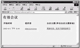 如果在前面已設(shè)置了提醒功能,那么在臨近會(huì)議前屏幕上將出現(xiàn)提醒窗口。教師機(jī)和學(xué)生機(jī)有三種方法可以參加會(huì)議:點(diǎn)擊提醒窗口中[參加會(huì)議]按鈕;或者不等提醒,直接點(diǎn)擊會(huì)議邀請(qǐng)函中的鏈接打開(kāi)會(huì)議網(wǎng)頁(yè);最好的方式還是打開(kāi)IE,輸入網(wǎng)址http://x/conferencing/list.asp進(jìn)入會(huì)議(x為Exchange服務(wù)器的IP地址或計(jì)算機(jī)名),如圖3。