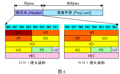 ATM信元實際上就是分組,為區(qū)分X.25分組(Packet)改稱為信元(Cell)。ATM信元具有固定的長度,總長為53字節(jié)。其中前5個字節(jié)為信頭(Header),包含各種控制信息,包括信元目的(邏輯)地址、糾錯碼、業(yè)務控制和維護信息等;后面48字節(jié)為信息字段(Payload),又稱凈荷,其中包含了業(yè)務的數(shù)據(jù),它們將被透明地傳輸。信元結(jié)構(gòu)如下圖6所示。在UNI接口和NNI接口上ATM的信元頭結(jié)構(gòu)是不同的。