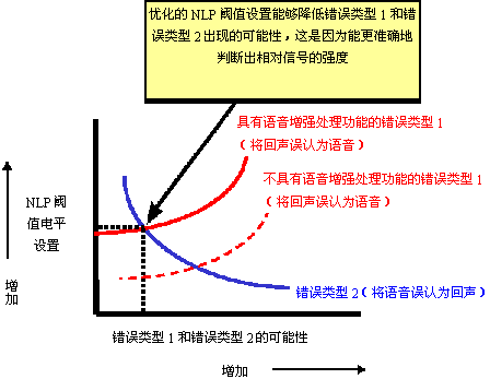 dB)能夠顯著降低將雙對話語音信號誤認(rèn)為聲學(xué)回聲信號的概率,從而防止了"錯誤類型2"。總之,在"錯誤類型1"(實線曲線,具有語音增強特性)和"錯誤類型2"曲線的交叉點上,通過與之對應(yīng)的NLP設(shè)置,可以獲得最佳的性能(請參見圖10)。
