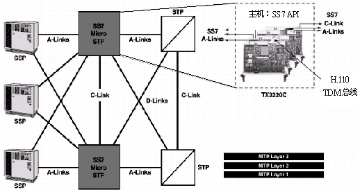 微型STP連接多條從SSP來(lái)的鏈路,并把它們集中到一個(gè)連接STP的鏈路集之中,這一鏈路集有兩條鏈路。微型STP到每個(gè)SSP也有兩條鏈路組成的一個(gè)鏈路集。微型STP由完全相同配置的一對(duì)構(gòu)成,以實(shí)現(xiàn)高可用性和高可靠性,兩個(gè)STP之間用交叉鏈路(C鏈路)相連接。另外,微型STP上的每個(gè)端口可以設(shè)置一個(gè)唯一的信令點(diǎn)編碼,以便移除SS7鏈路時(shí)不影響端點(diǎn)SSP。