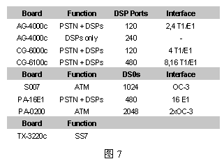 為具體起見,圖6給出一個(gè)960話音端口的應(yīng)用方案,其中用到了三種NMS公司的設(shè)備:AG-4000c、S007和TX-3220c,圖中未列出用來運(yùn)行應(yīng)用程序的CPU板(AG4000系列板卡不含CPU,而AG600eC包含了CPU)。