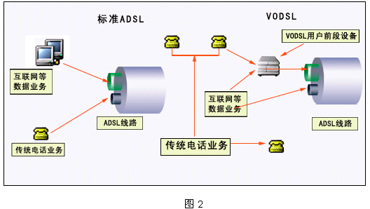 值得指出的是,圖2中VoDSL額外提供的話音電路VCH,和POTS是有很大區(qū)別的:1)POTS一般是模擬的,而VCH則是數(shù)字的;