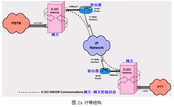 從PSTN來的呼叫被H.323網(wǎng)關受理,把其中的話音流轉(zhuǎn)換成IP數(shù)據(jù)包經(jīng)過IP網(wǎng)絡傳到目的網(wǎng)關下的指定電話終端;同時受理IP網(wǎng)絡來的呼叫(可以來自電腦終端或另一個PTT網(wǎng)絡)轉(zhuǎn)向PSTN目的終端1。