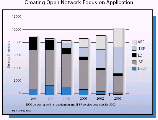 長距離時(shí)間日漸商品化。業(yè)務(wù)提供商不斷地尋求更高價(jià)值的,與眾不同的業(yè)務(wù)來幫助他們提高消費(fèi)者的滿意度和吸引新的客戶。新一代的業(yè)務(wù)提供商會(huì)在帶寬上依賴于第三方的運(yùn)營商,在Internet和語音服務(wù)器的基礎(chǔ)設(shè)施上依賴于托管業(yè)務(wù)提供商。而他們自己的精力將會(huì)主要放在建立一個(gè)本地接入上