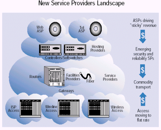 任何一個(gè)網(wǎng)絡(luò)的核心都是光纜和讓網(wǎng)絡(luò)工作起來的底層交換設(shè)備。傳統(tǒng)的業(yè)務(wù)提供商就是那些擁有這種底層設(shè)備的公司。但是打破傳統(tǒng)的語音環(huán)境為那些沒有這些底層設(shè)備的組織打開了向商業(yè)客戶和消費(fèi)者提供服務(wù)的大門。這種趨勢(shì)--網(wǎng)絡(luò)傳輸從電路交換轉(zhuǎn)變?yōu)榉纸M交換以及隨時(shí)可得的基于開放部件的劃算的業(yè)務(wù)平臺(tái)--使得這些新的業(yè)務(wù)提供商為自己的業(yè)務(wù)找到了商業(yè)機(jī)遇。