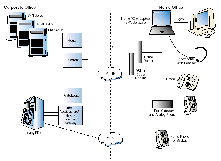 為了實現(xiàn)這個VoIP解決方案,PBX-IP網關連接到了辦公室里的原有的PBX和關鍵系統(tǒng)上,還有網守軟件實現(xiàn)一些呼叫的路由以及地址轉換。然后遠程辦公者連接到了網關上--最終連接到公司PBX上--或者使用IP軟電話,或者一個實際的IP電話,或者一個單端家庭網關連接到模擬耳機上。