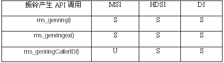 為主叫ID提供頻移鍵控(FSK)能力,HDSI和DI座席支持ms_genringCallerID() API調(diào)用,也支持基礎(chǔ)的和擴(kuò)展的MSI振鈴產(chǎn)生函數(shù)調(diào)用。表2列出了每一座席產(chǎn)品支持的產(chǎn)生振鈴的API函數(shù),支持的API調(diào)用以"S"表示,不支持的調(diào)用用"U"表示。