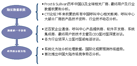 Frost & Sullivan 和 CTI論壇(www.chehaocha.com)共同組成的調(diào)研小組,在查閱了大量資料的基礎(chǔ)之上,以企業(yè)通信及呼叫中心的設(shè)備應(yīng)用、投資計劃以及相關(guān)廠商的市場表現(xiàn)為出發(fā)點,通過對企業(yè)通信及呼叫中心重要應(yīng)用企業(yè)、在市場占主導(dǎo)地位的二十多家設(shè)備廠商、二十多家軟件開發(fā)商、十幾家系統(tǒng)集成商、數(shù)家外包運營商的深度訪談,參閱內(nèi)部相關(guān)報告及數(shù)據(jù)庫,對數(shù)據(jù)的來源和數(shù)據(jù)的準確性進行了詳細核對與論證;憑借參與調(diào)研人員的多年從業(yè)經(jīng)